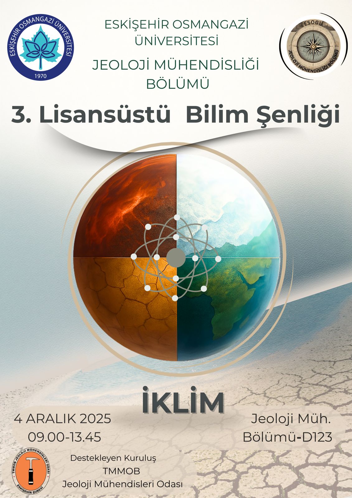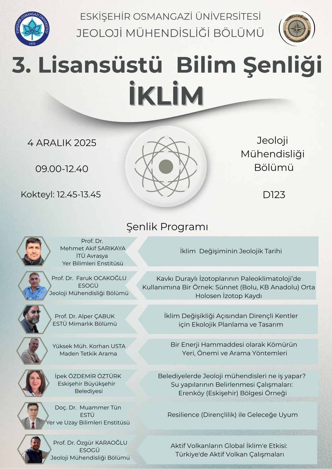 Eskişehir Osmangazi Üniversitesi Jeoloji Mühendisliği Bölümü tarafından düzenlenen 3. Lisansüstü Bilim Şenliği, bu yıl “İklim” temasıyla gerçekleştirilmektedir. Etkinlik, iklim değişikliği, doğal afetler, çevresel sürdürülebilirlik, dirençlilik kavramlarını bilimsel bir bakış açısıyla ele almayı hedeflemektedir. Şenlikte, farklı üniversitelerden ve kurumlardan alanında uzman konuşmacılar bir araya gelerek jeoloji, jeofizik, mühendislik, şehir planlama ve afet yönetimi gibi disiplinler arası konularda bilgi ve deneyimlerini paylaşacaktır. Bu etkinlik, yalnızca akademik bir buluşma değil, aynı zamanda tüm öğrencilerimiz ve öğretim elemanlarımız için bilimsel iletişim ve farkındalık açısından da önemli bir platformdur.